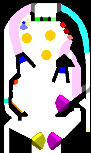 Designing the BoardWhen designing the game it is very helpful to keep board.gif and display.gif the same. This allows you to see how the ball reacts with the image.To make sure you have the correct color palette and such, I would advise opening tool.gif, resize it to the size you want your game to be, white out everything, and then save as board.gif. Now you know that board.gif is a .gif file with the correct color palette. The LauncherTo create the launcher, we go to our helpful tool image. On it are 2 launcher images, select and copy the left one. Now paste it into your board in the lower right corner. Position for the launcher is VERY important. You want to make sure the black sides of what you are pasting fit into the corner exactly. The second image on the tool is for the display and we will use that later.The CornerBecause the applet uses an image for it's key, it's a granular world to say the least. In other words there are no smooth curves. This was a problem because I wanted my games to have the generic banking corner the ball encounters after being launched. This required special code to fix. On the tool is an image of the corner. Copy it to your board.gif and put it in the upper right corner. You can modify it if you want, but mine works quite well. For your information if you choose to change it, the light blue color tells the ball to always bounce off a wall heading 45 degrees left of center (NW) and don't slow the ball due to a wall collision. This code only kicks in when the ball is going up the ramp. If it loses speed, it will successfully bounce back down it.The PaddlesThe tool has on it how the left and right paddles should look on your board.gif. Once again copy and paste away. It is important that the paddles not be placed too low in your game, such that the black part of their image is falling off your board. You can also add secondary paddles (one for each side) using the same color scheme. For the typical bottom 2 paddles, you can try different spacing, but the spacing in the tool seemed very realistic. Do make sure the area above them is free from other objects since the ball initially breaks the speed limit when coming off the paddles. By this I mean it travels higher than I allow anywhere else in the game, see the discussion on the walls for more information on this limit. Note the white pixel at the paddles base among the black. Once pasted into your image, note the X,Y position of that pixel. This information must be put in your pinball(2).html under the parameters for each paddle (rightmain, rightsecond, leftmain, leftsecond). If you don't use a paddle there is no need to list it in the parameters.WallsAs the guide tells you, walls are designated by the color black. Walls should be made 10-13 pixels thick depending on where they are used. The reason behind this is that the ball has a speed limit of movement of 9.9 pixels per frame shown(it may have a speed over the limit, but only the limit is shown). This is because our ball is only 13 pixels in diameter. Remember that the game is constantly monitoring 12 spots around the ball waiting to detect a wall. If a wall is too thin, the ball might blow right through it. You will notice on my board.gif that they are quite thick and bulky looking. This was done on purpose. Now, walls may be thinner in areas where you know the ball speed will be low. This can be seen along the chute on the right side. I am assuming another wall will be placed along the left side of the launch area like most pinball games. Thus no ball will ever be hitting the wall at 90 degrees at full speed. Also, because of this same phenomena, corners should be rounded and not necessarily pointed. This helps in keep the ball from doing weird stuff around them.A good next step for your board is to draw the thin wall from the launcher to the corner, and then draw a thicker line along the top and left side of your board. Also draw in the thick wall on the left side of the launcher from the plunger up to the start of the corner. You may also try some stuff on the bottom by the paddles. Save your board as board.gif and display.gif and then you are ready to try out your game to see how it is doing. GatesGates allow the ball to go through them in one direction, but act as a wall in the opposite. For these you should also make thick for when they act as a wall. I have seen the ball get stuck on rare occasions near gates. Unable to fix the problem in the code, I redid my board. If you notice the upper left gate by the chutes on my board, I added a chunk of grey to it on its right side. This was because the ball would occasionally stick here. After the change, I never saw it happen again. Note for Advanced Users: Currently there is no down-gate modeled and several changes would need to be made to implement the idea. To get around this I have used the idea of ramping (discussed below) to accomplish this. So I basically put a wall that the ball can drop off going down, and then bounce off going up. This is done without the player even knowing they entered a ramp.Bumpers and KickersBumpers and kickers both knock the ball away from them at a speed slightly higher than the speed limit. Along with paddles, walls and gates, bumpers and kickers are items checked for in the 12 spots around the ball (every other color is based on the pixel at the center of the ball). The difference between the 2 is that bumpers throw the ball away from them perpendicular to the striking surface. Kickers on the other hand let the ball reflect symmetrically, but give it full power in its new direction. Because of this, it is advisable to not put walls and other strike objects too close to these.The Cover ImageThe graphic image.gif (shown on the right in real size and magnified 3x) is used to cover lights in the game. On the display these lights/indicators are actually drawn 'on'. The cover is used to hide the light when it has turned off. In my case the covers are really black pixels wit