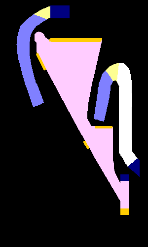Designing Ramps/TunnelsThe ramps.gif image is used in the same way as board.gif. The game, through color codes, knows which of these 2 keys to use.Entries and ExitsEntering and exiting the ramps are detected by the colors indicated in the tool image. When the game detects that the ball has hit the enter-ramp color, it stops using board.gif as the key and instead uses ramps.gif. The opposite occurs when the exit-ramp color is touched. Thus your ramps and board images need to work closely together. I draw my ramps by copying board.gif and then drawing in the ramps and blacking out everything else. Note for Advanced Users: The ramp idea can also fix some ball embedding problems near the paddles. As stated, the ball comes off the paddles greater than the game's speed limit and will occassionally embed into a wall near the paddle with weird results. What you can do is put a tunnel entrance beyond the wall and then design your ramp image to redirect the ball back into play. If by chance the ball embeds into the wall, it will then enter the ramp and roll back onto the board, unbeknownst to the player.Hiding the Ball and TunnelsNow, when a ball goes under a ramp, you don't want to see it. To hide it you will need to use the hide-ball color from the tool. Quite simply, anytime the ball encounters this color it is not displayed. This is normally used on the board.gif image. However it can be used on ramps.gif to simulate tunnels. Tunnels work just like ramps and use the same controlling image, except the pink hide color is used to keep them hidden. The wide middle area on my ramps image is an example of this. I made the tunnel wide with a few kickers to get the ball through it faster. The ball's last motion is upwards as it bounces off the bumper at the bottom to pop back into view and out of the 'ramps'. When designing this tunnel, it was helpful at times to not hide the ball (use white instead of pink), so I could see what path the ball actually took.SlopesThe game is always sloping down. However whenever the 3 sloping colors are detected, this changes. I designed the slope coding to help in moving the ball through ramps. I had to find a way to make the ramp go downhill and the code uses the colors to accomplish this. You will also note that the tunnel entrance near the upper left of my board.gif has these sloping colors around it. This causes the ball to take a curved path near the 'hole' as if it was circling around the rim of the hole. Note for Advanced Users: Previously it was mentioned to avoid near horizontal surfaces to avoid the ball hanging up there. However, these low angle surfaces are possible using the slope idea. What I have done is put a slope in front of the wall, so that a ball sitting on the gentle slope will be pushed down it. However, the effect did not look right until I actually drew verticle lines separated by 1 or 2 pixels in the slope color. This slowed down the movement of the ball so it didn't look like it was shooting off the slope. |