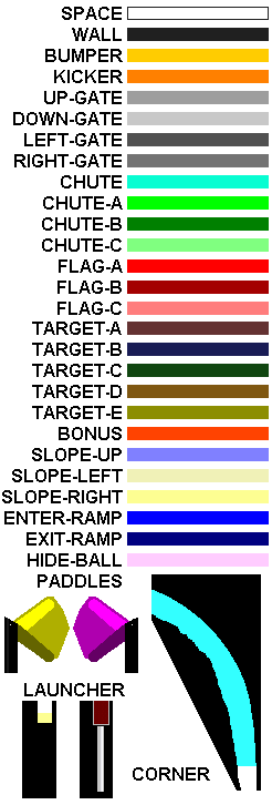 Things you need and need to knowYou may want to read the concept portion of this site to get background on the game.As stated, this game is driven by .gif files. Thus you will need a graphics program that is able to create .gif files. The better you are using your graphics program the better and easier to design your games will be. Recall that in designing images and programs, the point 0,0 is in the upper left corner of the image and increases positively to the right and down. You will also need to know a very tiny bit of HTML coding (and maybe some JavaScript). As you design your own, it is very helpful to see examples. I currently have several examples in the offline zipped package. With these you can see the parts and how they work: pinball.zip The file contains everything you need to run the pinball games offline including the jar file that is the applet. I would also recommend right clicking the image to the right (tool.gif) and saving it for reference. Let's talk about that image on the right. Remember, the game is controlled by colors, and you have to be exact with them. Use this tool as a paint board to properly select the color you need. Also the bottom has some guides to directly cut and paste into your images. |